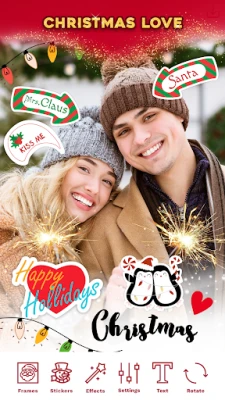 "Božićni okviri za fotografije i čestitke" je besplatan uređivač slika za stvaranje čarobnih božićnih i novogodišnjih čestitki. Uljepšajte fotografije blagdanskim okvirima, naljepnicama i pozadinama. Širite radost uz savršene blagdanske uspomene.
