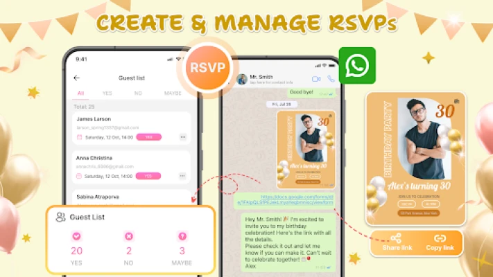 Osim što olakšava izradu estetski privlačnih pozivnica, Invitation Card Maker & RSVP revolucionira i upravljanje događajima. Integrirana RSVP funkcionalnost omogućava vam neometano praćenje potvrda dolazaka gostiju, često putem jednostavnog Google Forms linka. Pratite odgovore u stvarnom vremenu, efikasno organizirajte popis uzvanika i automatski ažurirajte sve promjene vremena ili lokacije. Pošaljite digitalne pozivnice, spremite ih kao sliku ili PDF, ili ih čak pripremite za ispis. S lakoćom dijelite svoja umjetnička djela i upravljajte dolascima, čineći planiranje događaja nevjerojatno jednostavnim i bez stresa.