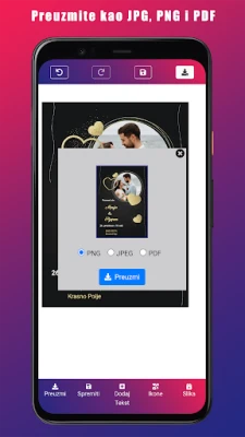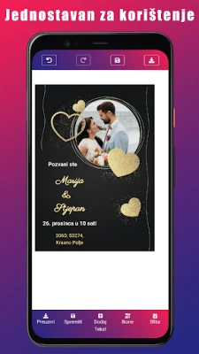 Proces je nevjerojatno jednostavan i teče u samo tri koraka: prvo, odaberite predložak koji vam se najviše sviđa; zatim, prilagodite ga vlastitim fotografijama, tekstom i bojama, dajući mu osobni pečat; i konačno, pripremite svoju kreaciju za dijeljenje. Aplikacija podržava izvoz u visokoj rezoluciji (JPEG, PNG ili PDF spreman za tisak), omogućujući vam da svoje pozivnice jednostavno podijelite putem e-pošte, WhatsAppa, Vibera, Instagrama ili bilo koje druge popularne aplikacije za razmjenu poruka. Radite izvan mreže, u bilo koje vrijeme i na bilo kojem mjestu, s potpunom slobodom. Za sva pitanja ili podršku, naš tim stoji na raspolaganju putem e-pošte `