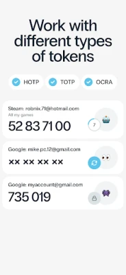 Prijelaz na Protectimus SMART OTP je jednostavan; lako prenesite tokene s postojećih autentifikatora kao što je Google Authenticator i s lakoćom premjestite sve svoje podatke na novi uređaj. Aplikacija je dodatno obogaćena značajkama koje povećavaju praktičnost korištenja: primajte push obavijesti za brze autorizacije, personalizirajte svoje tokene jedinstvenim emotikonima i opisima te ih organizirajte u prilagođene mape za optimalnu preglednost. Uz to, Protectimus SMART OTP podržava više jezika, uključujući engleski, francuski, njemački, španjolski, ruski i ukrajinski, čineći je globalno pristupačnim rješenjem za svakoga tko cijeni sigurnost i jednostavnost.